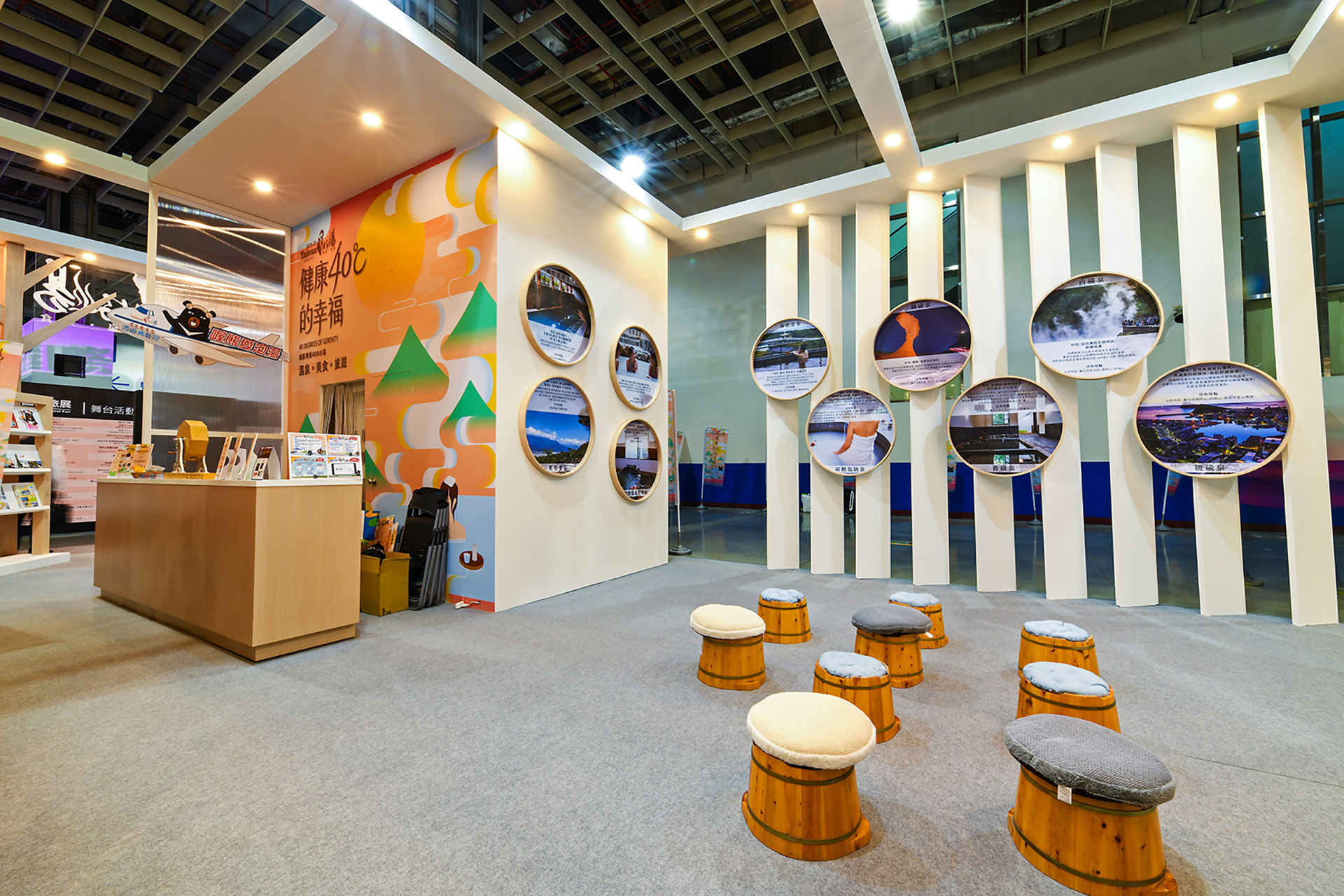 以溫泉木桶造型作為休憩座位,成為設計亮點。讓參觀者在短暫停留時,也能感受到泡湯文化的體驗趣味。