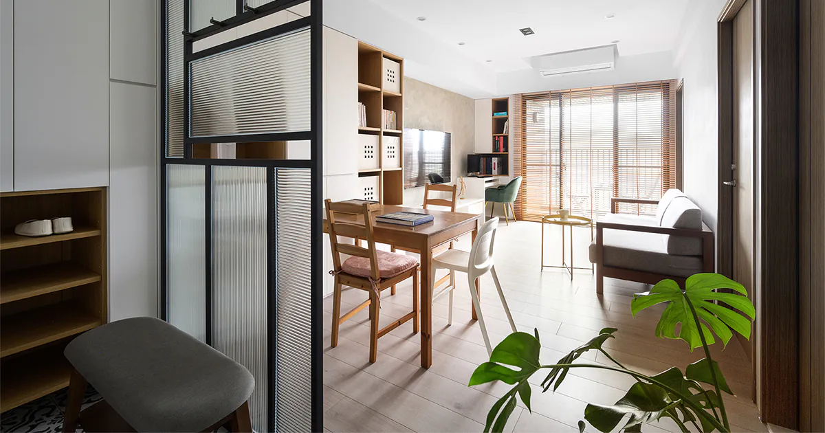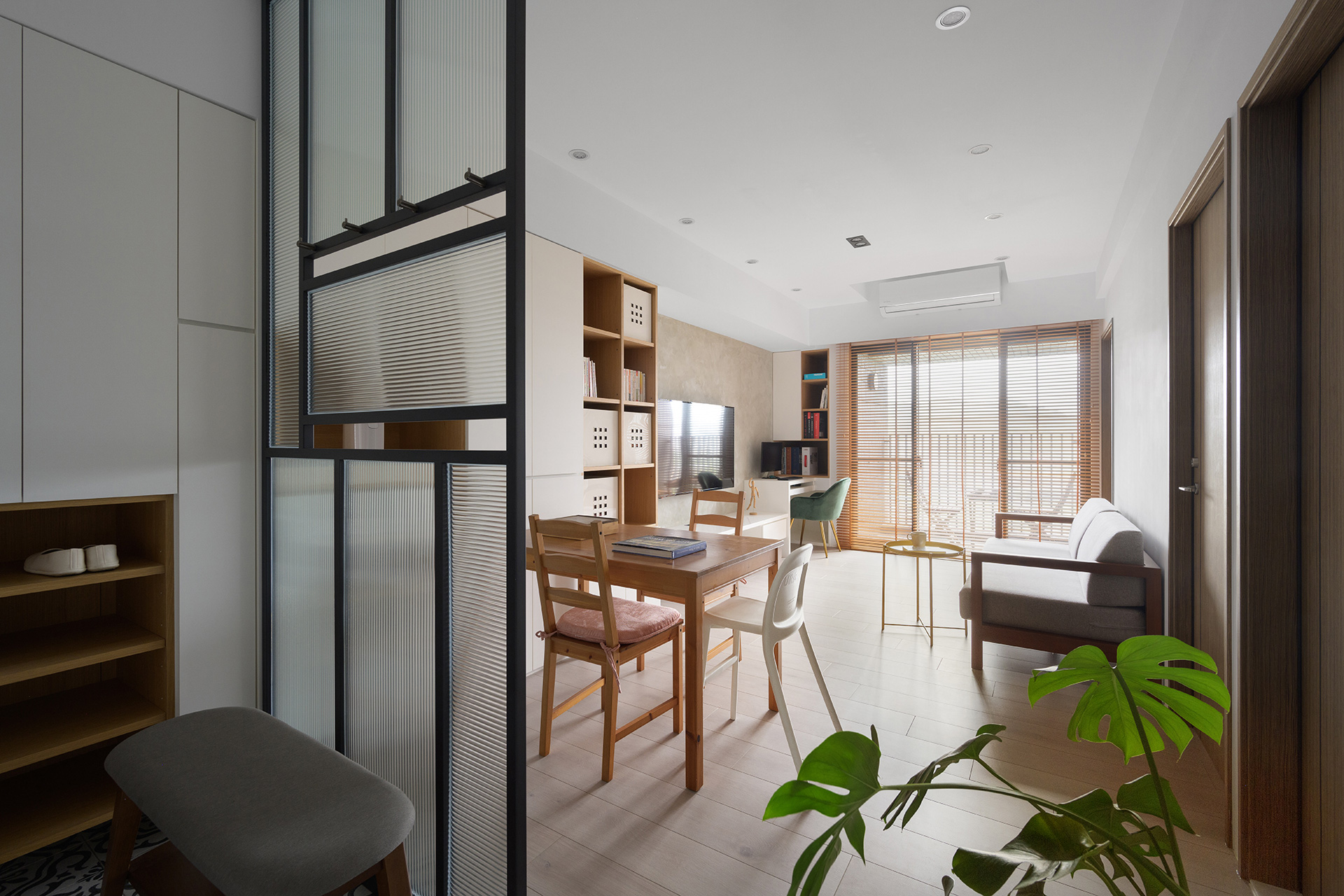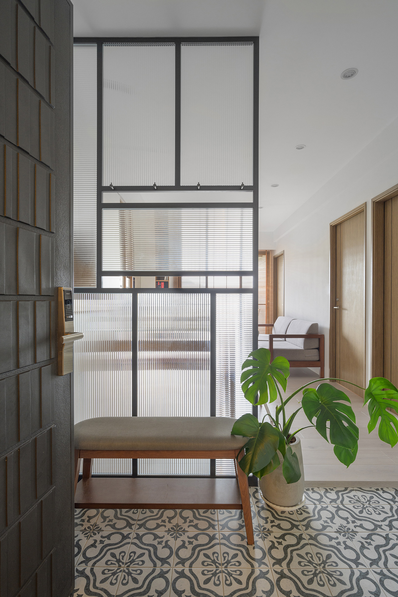 ▍ 透過玻璃隔間與黑色金屬框架,清楚劃分玄關與客廳等功能區域,同時保留空間的穿透感與通透性,有效提升整體延展感。