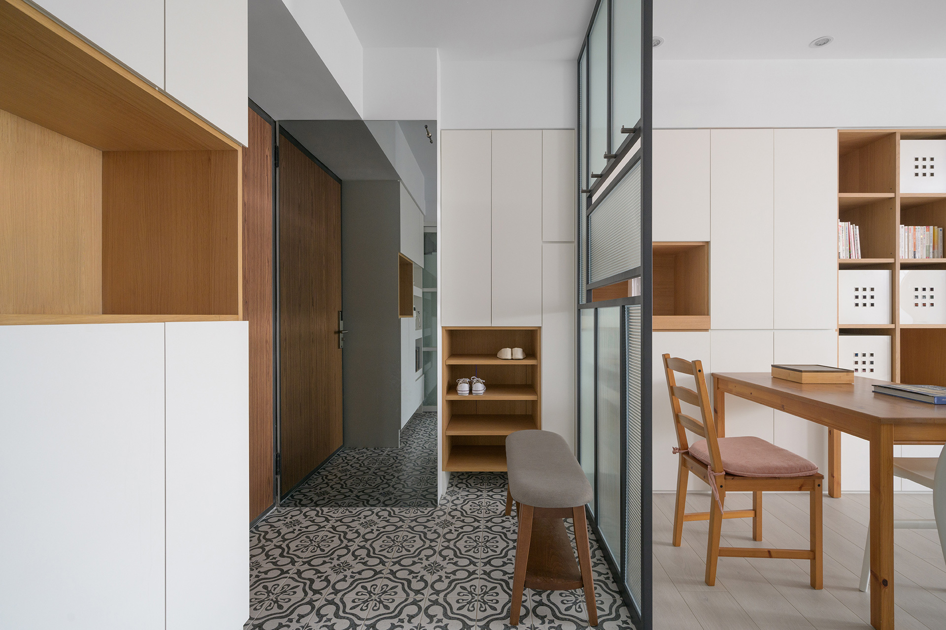 ▍ 從玄關的歐式花磚到客廳的淺木地板,材質搭配體現潮穎設計對色彩應用的專業能力。
