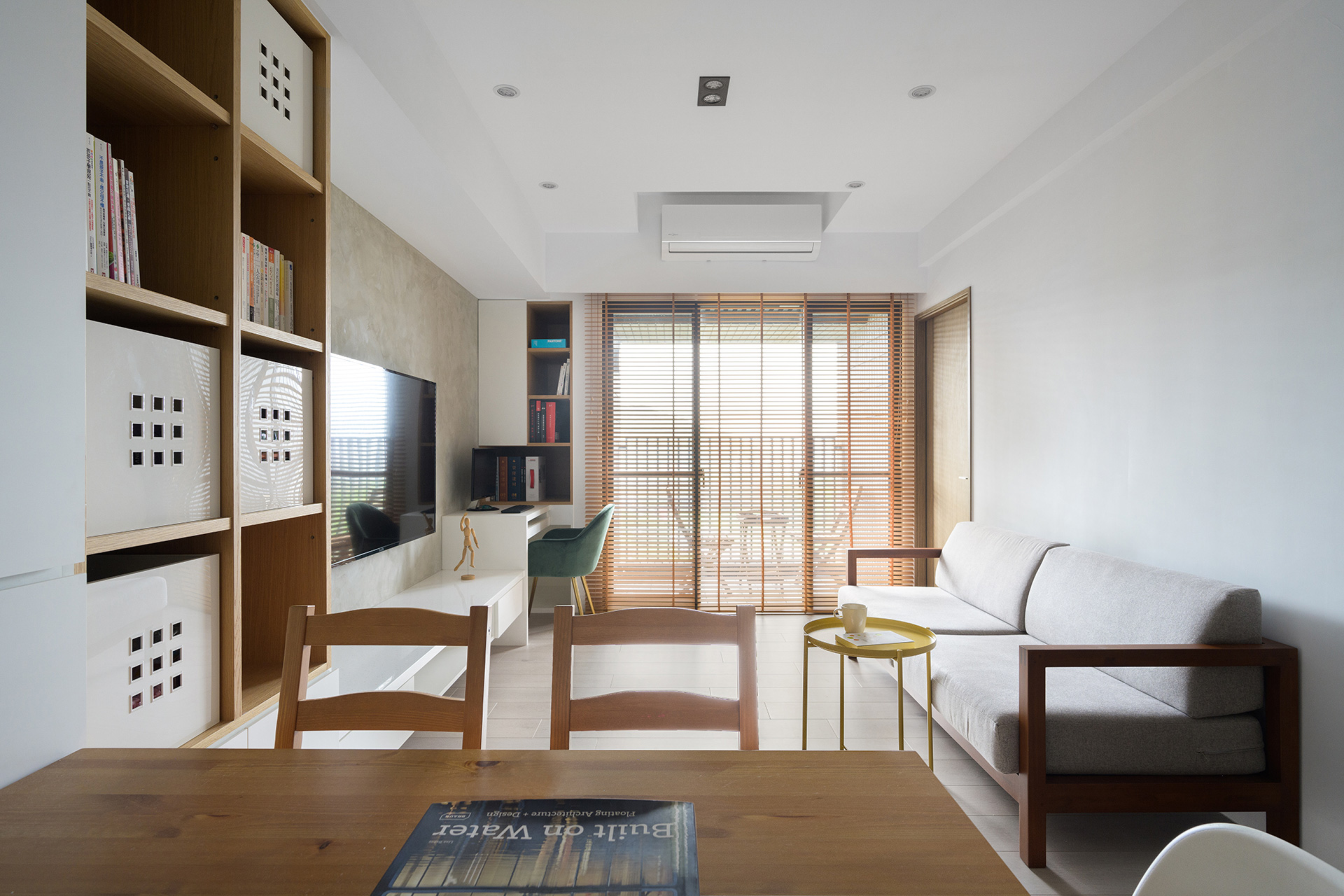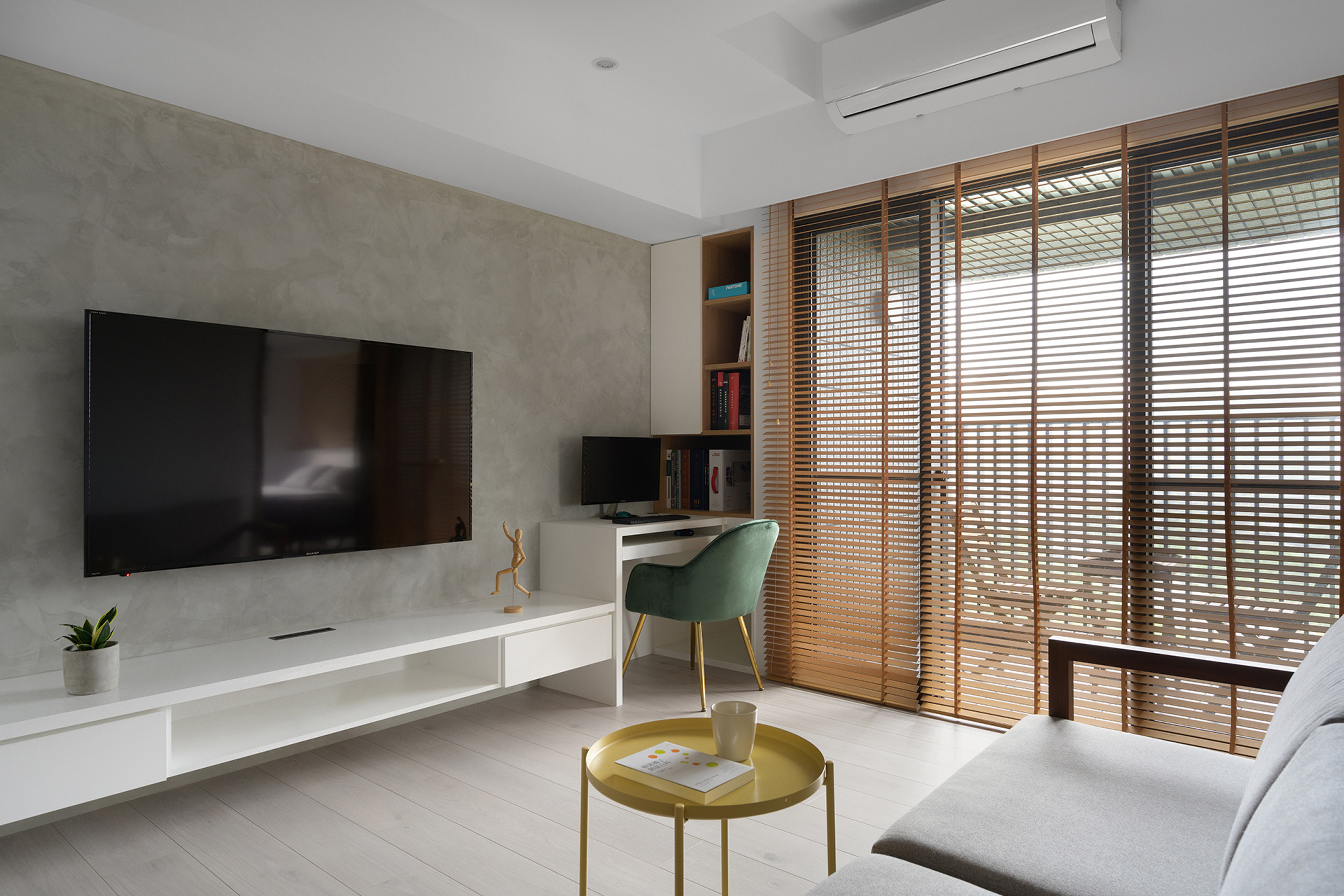 ▍ 整體空間以白色與淺木紋為基底,並加入水泥質感電視牆,增添視覺層次與現代感。