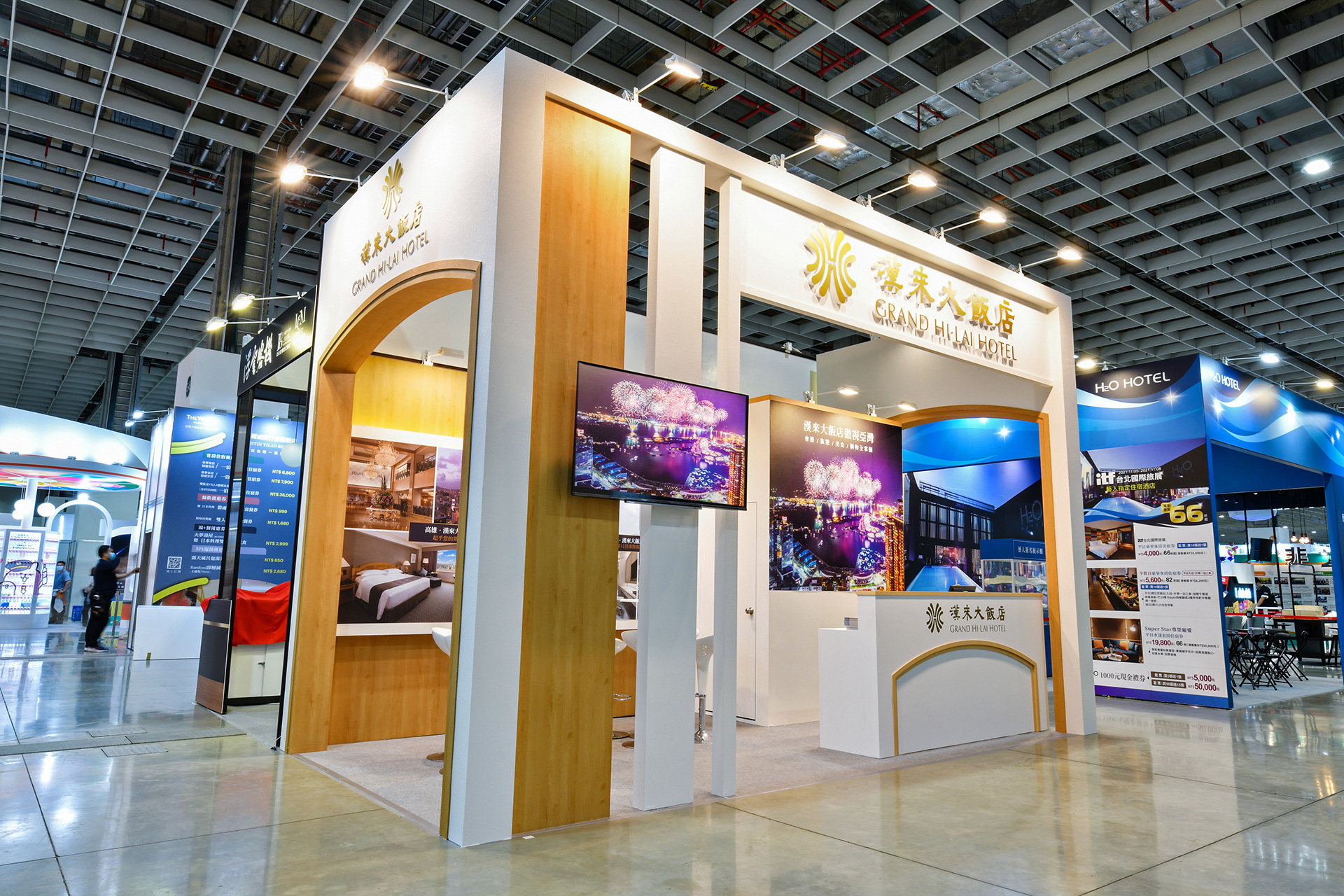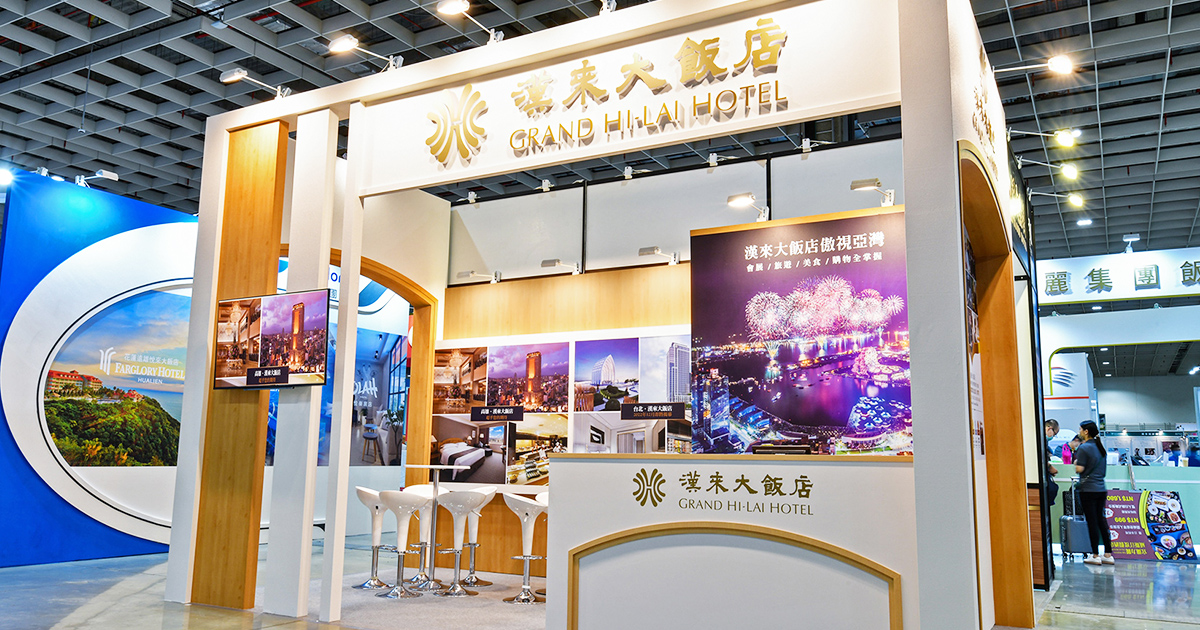 本案為潮穎設計協助「漢來大飯店」於「2021 台北國際旅展」打造一個兼具 高級質感與空間動線規劃 的展覽攤位。