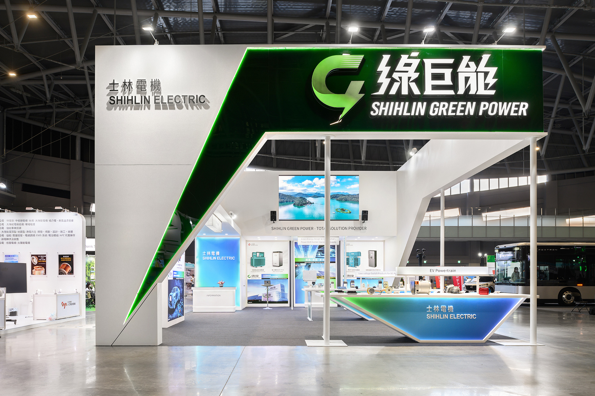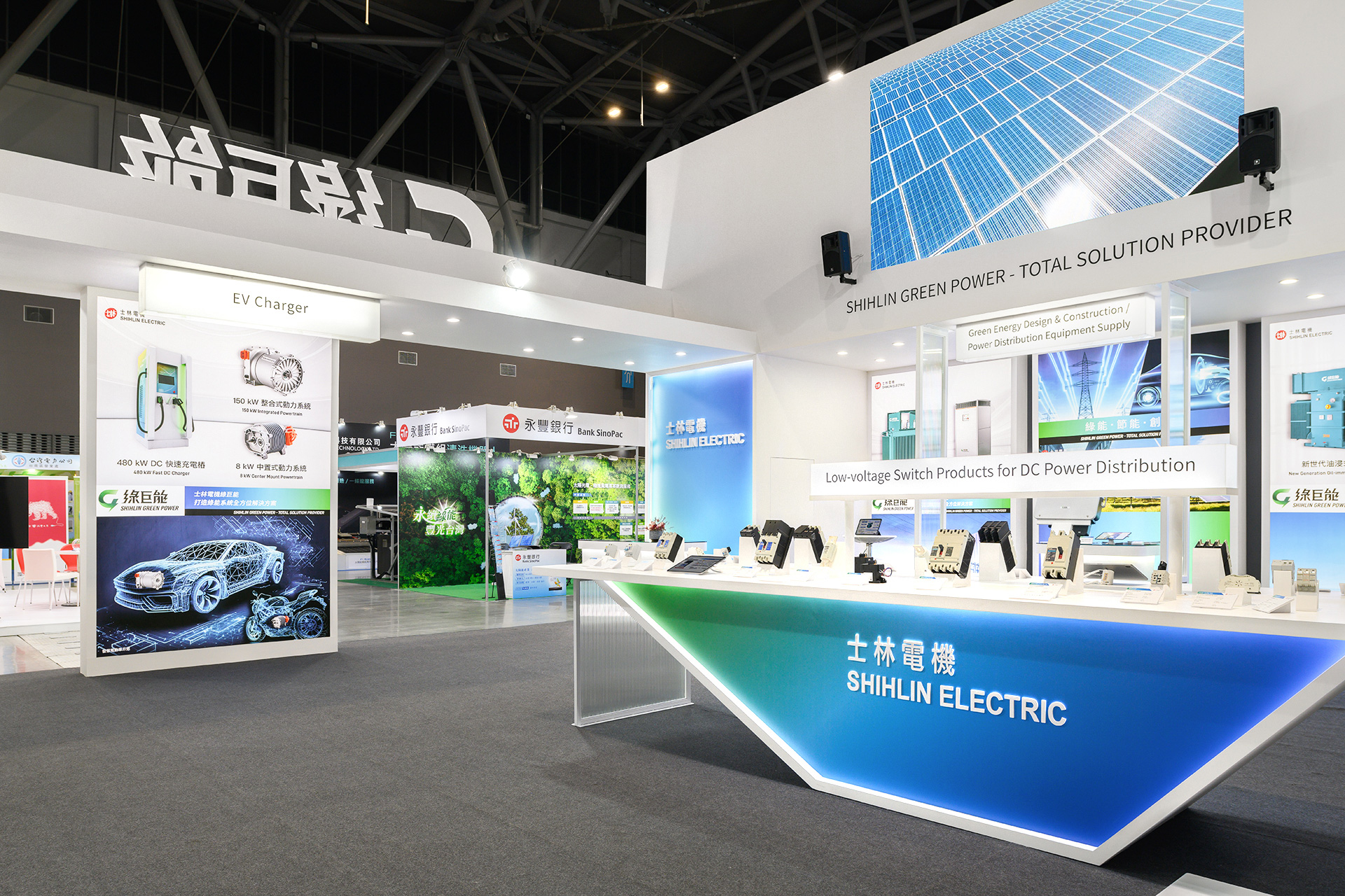 攤位視覺以綠色象徵環保、藍色代表科技,完整呈現士林電機品牌「永續創新」的設計語言。